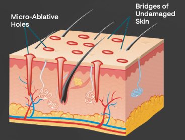 The laser creates microscopic “columns” of treated tissue surrounded by untouched skin — these healthy bridges accelerate recovery and collagen regeneration.